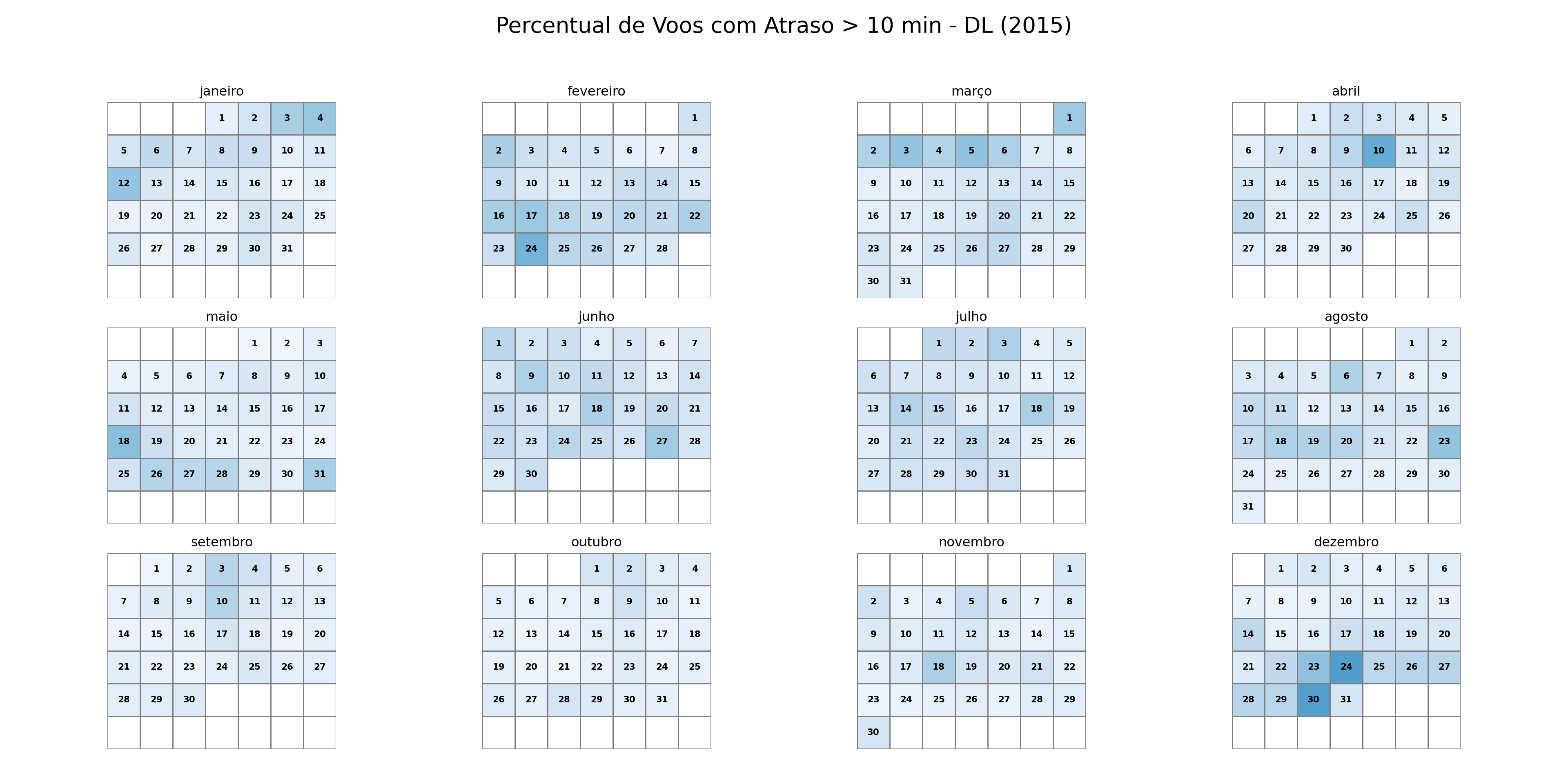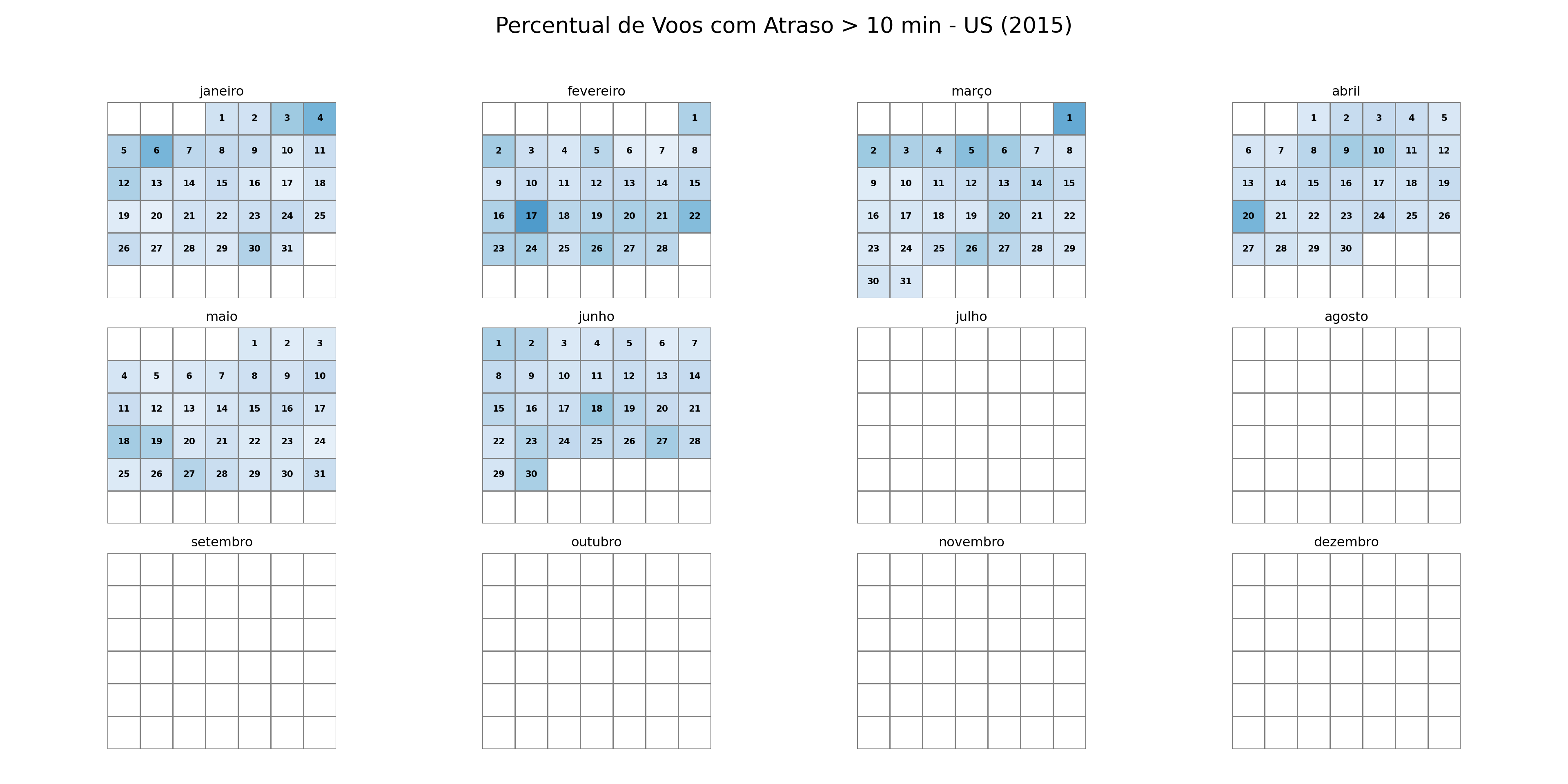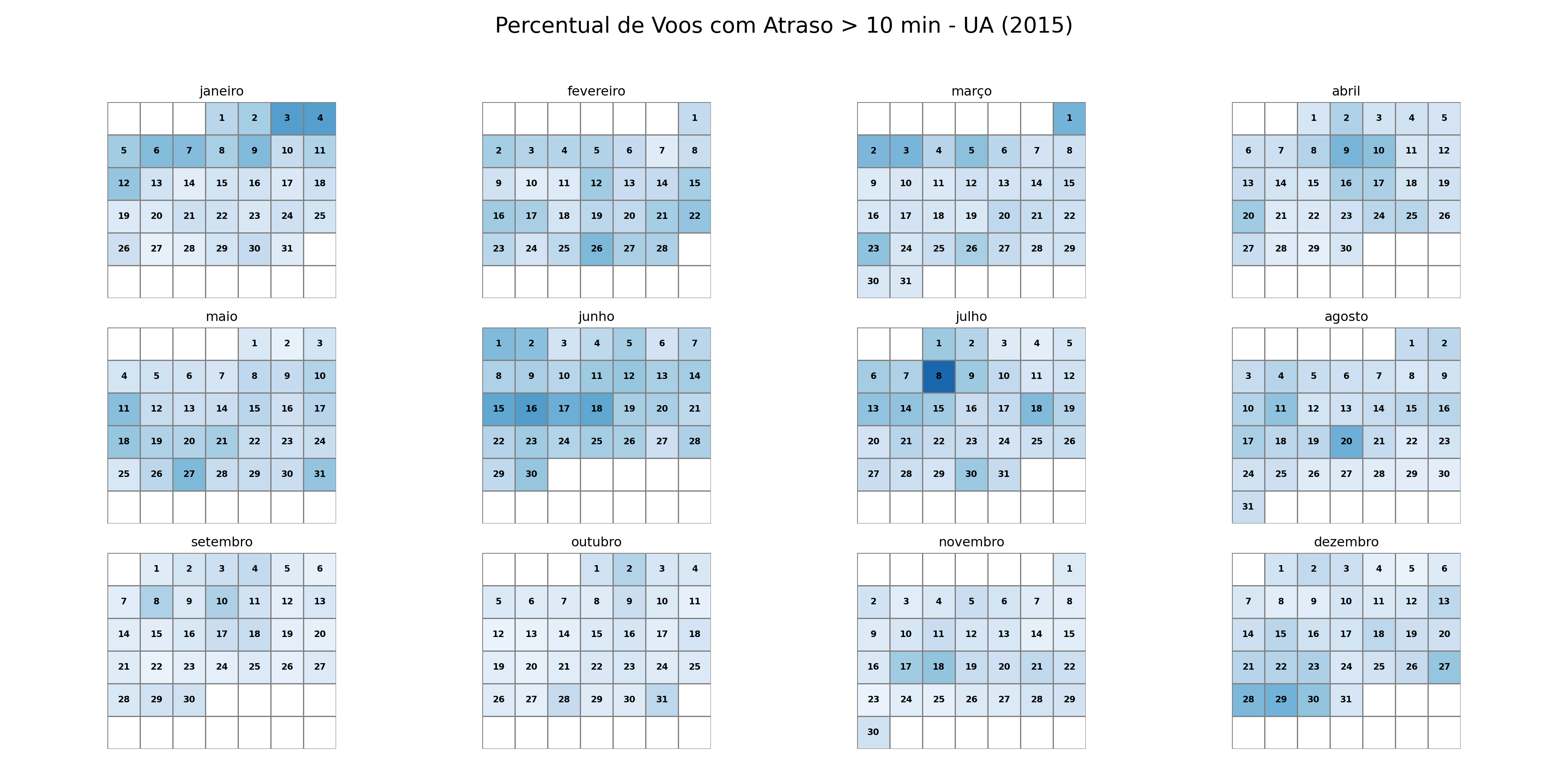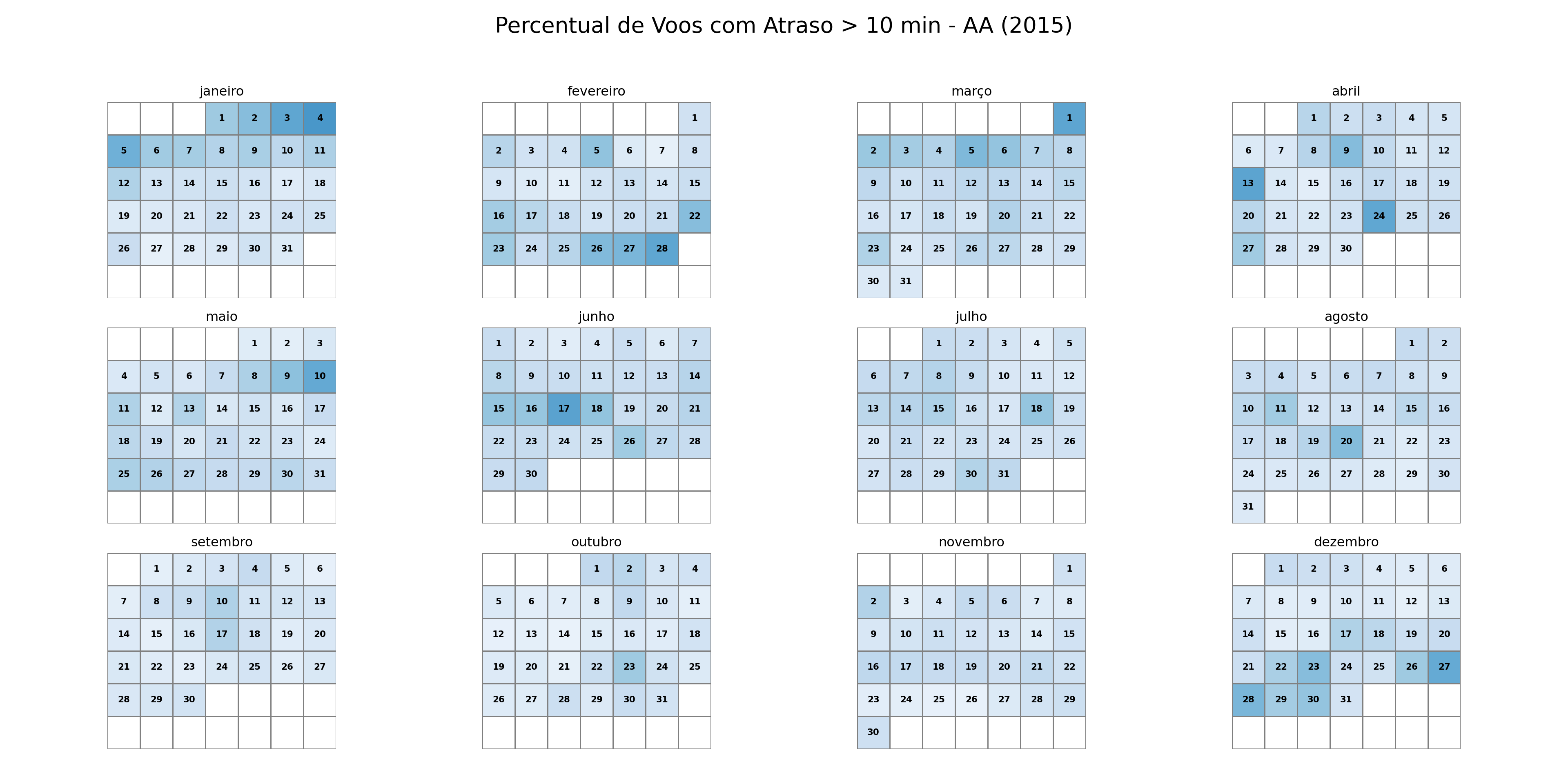 stats_parciais = pd.concat(lista_chunks, ignore_index=True)# Função para agregar as estatísticas de todos os chunksdef compute_stats(stats): stats_finais = ( stats.groupby(["YEAR", "MONTH", "DAY", "AIRLINE"]) .agg( n_total=("n_total", "sum"), n_atrasados=("n_atrasados", "sum") ) .reset_index() ) stats_finais["Data"] = pd.to_datetime( stats_finais[["YEAR", "MONTH", "DAY"]] ) stats_finais["Perc"] = stats_finais["n_atrasados"] / stats_finais["n_total"] stats_finais["Cia"] = stats_finais["AIRLINE"]return stats_finais[["Cia", "Data", "Perc"]]stats_finais = compute_stats(stats_parciais)# Função para plotar o calendário de atrasosdef plot_calendar(stats, cia, year=2015): df = stats[(stats["Cia"] == cia) & (stats["Data"].dt.year == year)].copy() df["Month"] = df["Data"].dt.month df["Day"] = df["Data"].dt.day fig, axes = plt.subplots(3, 4, figsize=(20, 10)) fig.patch.set_facecolor('white') # Define o fundo da figura como brancofor month inrange(1, 13): ax = axes[(month -1) //4, (month -1) %4] month_days = calendar.monthrange(year, month)[1] month_df = df[df["Month"] == month] first_weekday = calendar.monthrange(year, month)[0] data = np.full((6, 7), np.nan) day_labels = np.full((6, 7), "", dtype=object)for _, row in month_df.iterrows(): day_num = row["Day"]# Posição no calendário: (dia + primeiro_dia_da_semana - 1) total_pos = day_num + first_weekday -1 week = total_pos //7 weekday = total_pos %7# Correção para garantir que não saia do arrayif week <6: data[week, weekday] = row["Perc"] day_labels[week, weekday] =str(day_num)# Heatmap sns.heatmap( data, cmap="Blues", cbar=False, ax=ax, linewidths=0.5, linecolor="gray", square=True, vmin=0, vmax=1, annot=day_labels, # Usa o array de dias como anotação fmt="", # Formato vazio para que os números sejam mostrados como strings annot_kws={"color": "black", "fontsize": 8, "weight": "bold"} ) ax.set_title(calendar.month_name[month]) ax.set_xticks([]) ax.set_yticks([]) fig.suptitle(f"Percentual de Voos com Atraso > 10 min - {cia} ({year})", fontsize=20) plt.tight_layout(rect=[0, 0.03, 1, 0.95]) # Ajusta o layout para o título principal plt.show()# Gerar os gráficos para cada companhia aéreaplot_calendar(stats_finais, "AA", 2015)